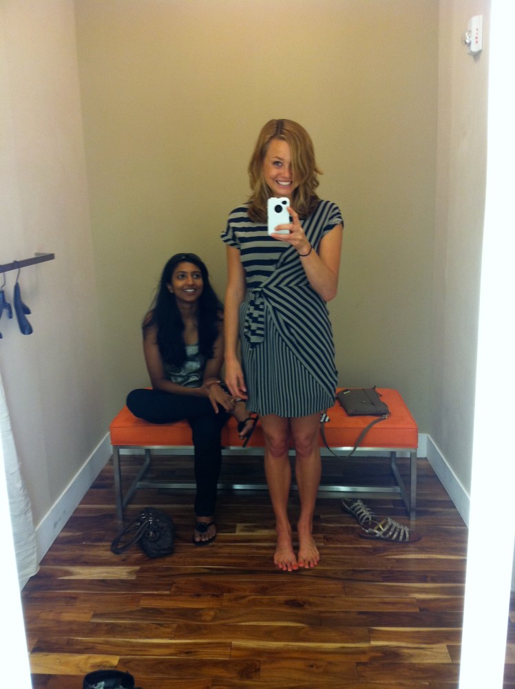 Saturday we slept in, made a kick-ass brunch, and headed to the gym because it was POURING OUTSIDE. Like, almost hurricane-force storm with black skies, strong winds, and intense flooding. I translated the storm’s fury into a great workout (sorry if you are still sore Lucky!). After I was Lakshmi’s personal trainer, she became my personal shopper at the mall where I tried on some dresses to find my “style”. The dress below is my style winner, but a loser on price. I will have to wait for the perfect dress to find me.