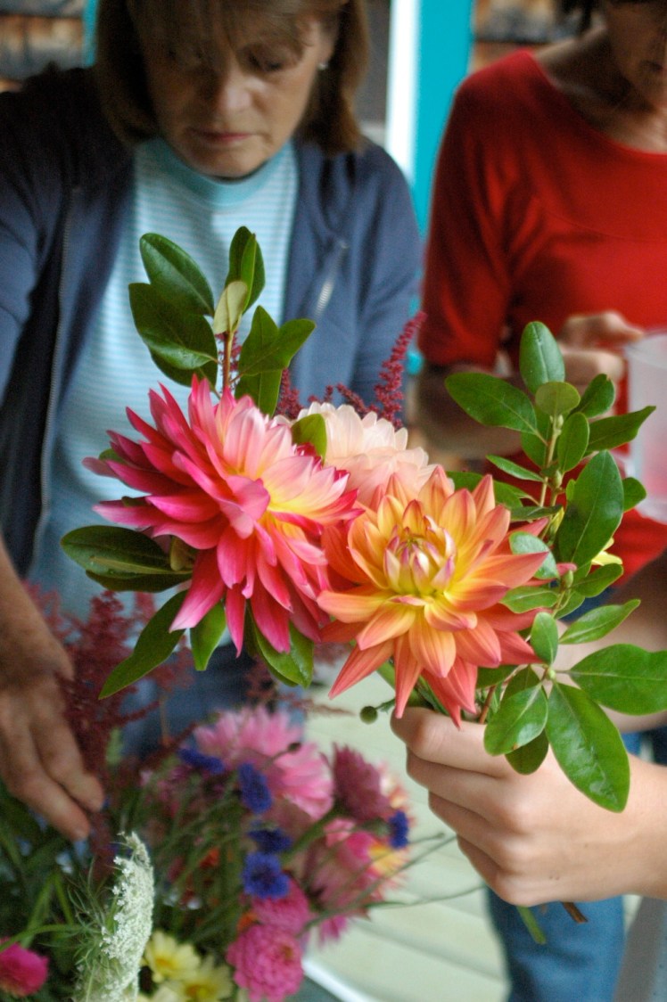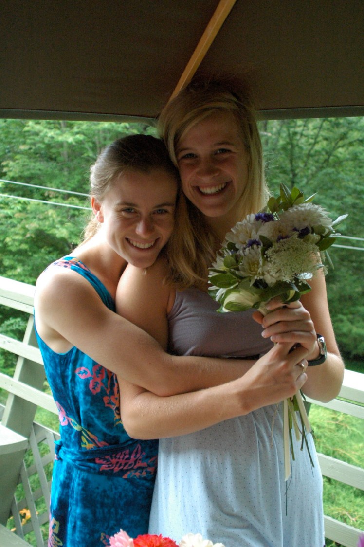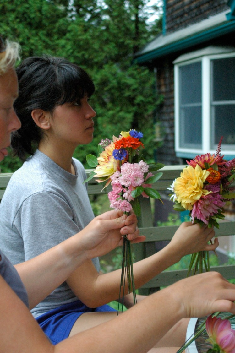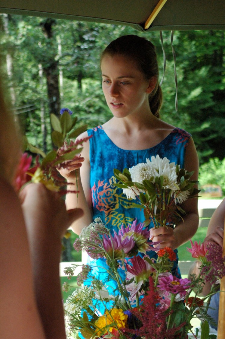 After a wonderful Rehearsal dinner Friday night, Caitlin and I ate some delicious breakfast at Whitehall Inn and headed over to the bride’s house to help make the bridal bouquets. The flowers came from her mother’s garden and they were absolutely beautiful. The girls did a great job of assorting the flowers into beautiful bouquets, although it was hard and took a long time!