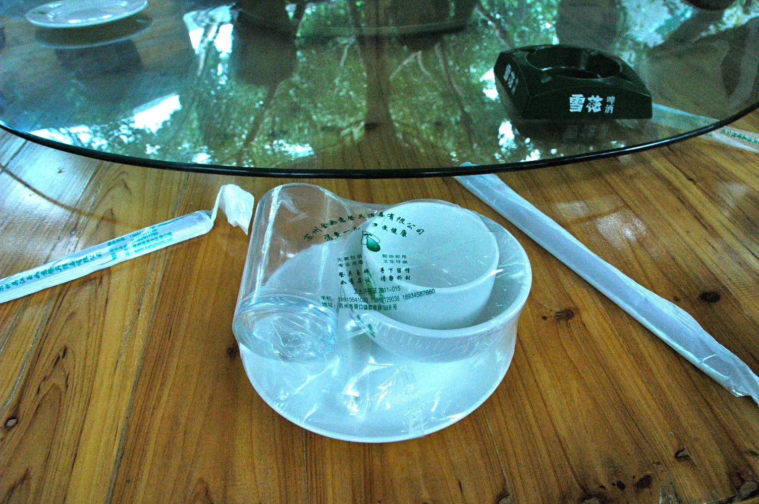 The dishes come plastic wrapped to feign cleanliness. They did seem clean though…