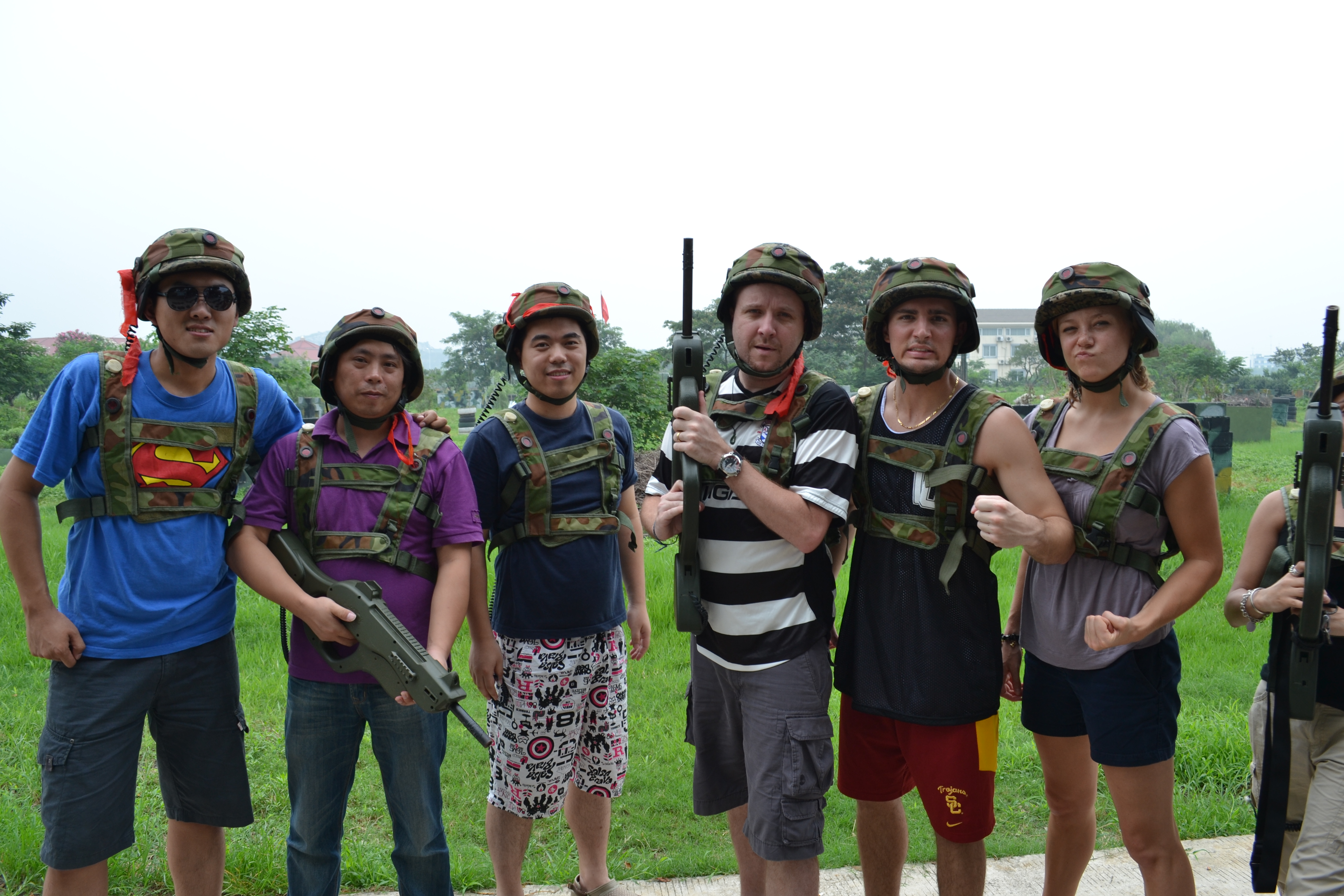 Next on our to do list is this sort of laser tag game. We split into two groups, don smelly camo gear, and stand at attention for about 10 minutes while this Chinese guy yells instructions at us… in Chinese. The four of us there who don’t speak Chinese look at our imaginary watches and itch our sweaty helmut heads. After the longest 10 minutes of my life, Peter translates for us: “Plug your backpack into your helmut and gun. And don’t get shot”. Um… THANKS. So we plug in and run off into the field to hide among the long grass and constructed huts. Peter, my team leader, apparently has a plan and yells directions while me and my other more incompetent team members hide and kind of roll around in the grass. Several times I successfully sprint from dug out to dug out and attempt to shoot people. My backpack is beeping, my gun is making weird noises, and I don’t know if I’m actually hitting people, being hit, or just dead. Those instructions were somehow lost in translation.