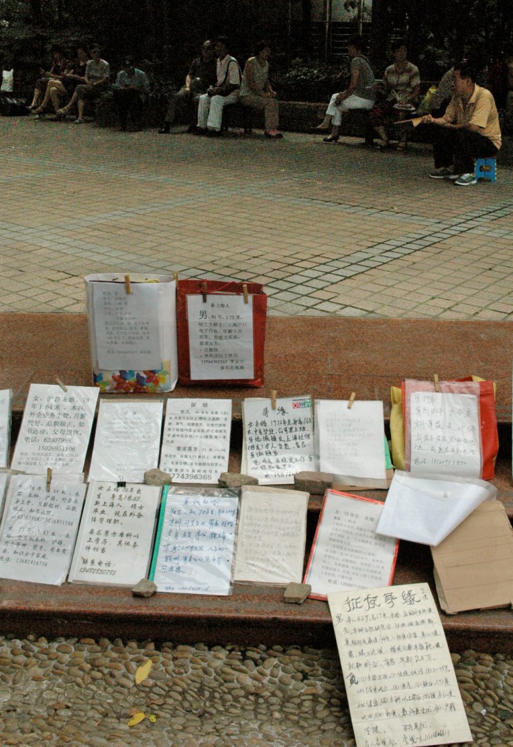 Brian arrives and takes us into the park to quickly browse some potential husbands and brides. Yes, you heard me correctly. Every weekend Chinese parents gather in this one section of the park bearing a piece of paper describing their marriageable children in hopes of finding them a spouse. These “children” range from age 17 to 35 and, according to Brian and Peter, have varying characteristics. Some men and women work abroad and have no time to find a spouse, thus the parents get into action. It is a bizarre idea and even more bizarre scene just clogged with people walking among the aisles as the parents sit on the sides waiting for a bite. Almost like flea market sale… for invisible spouses. Unfortunately none of the personal ads caught our eye and we left empty handed, literally! Get it? No ring? Ok moving on.