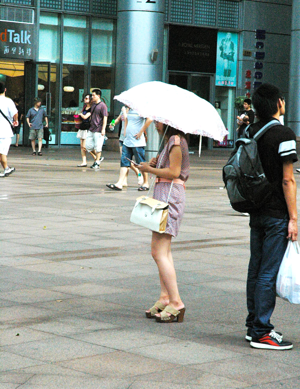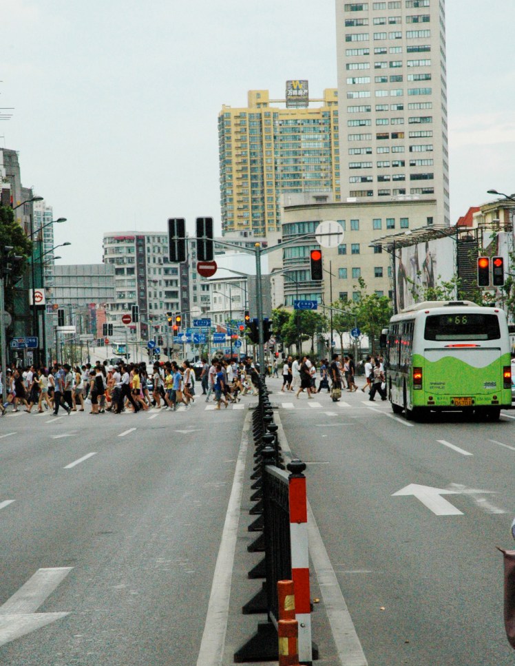 We find a very Americanized cafe with great sandwiches and coffee. It is just what I need. Caffeine and bread?? Yes please. After munching and cooling off in the air conditioning I am revitalized and ready to roll. However, I have to take a quick pit stop before we walk indefinitely. This leads to a very unfortunate public restroom experience leaving me more exhausted and disheartened than before. The bathroom is extraordinarily smelly and hot with no toilet paper, toilets, or soap. In each stall there are porcelain holes in the ground that have the tendency to erupt in a geyser of doom upon flushing. What I will say to anybody, China would be great if they spent the money on the basic luxuries… like clean public restrooms that are properly equipped. Everybody would be so much happier. Although I will say that squatting is great for your legs. Haha! Shaken, but still alive, I quickly escape the restroom to the clean(er) outside air. Peter, Brian, and I head back to the subway as I snap photos along the way.