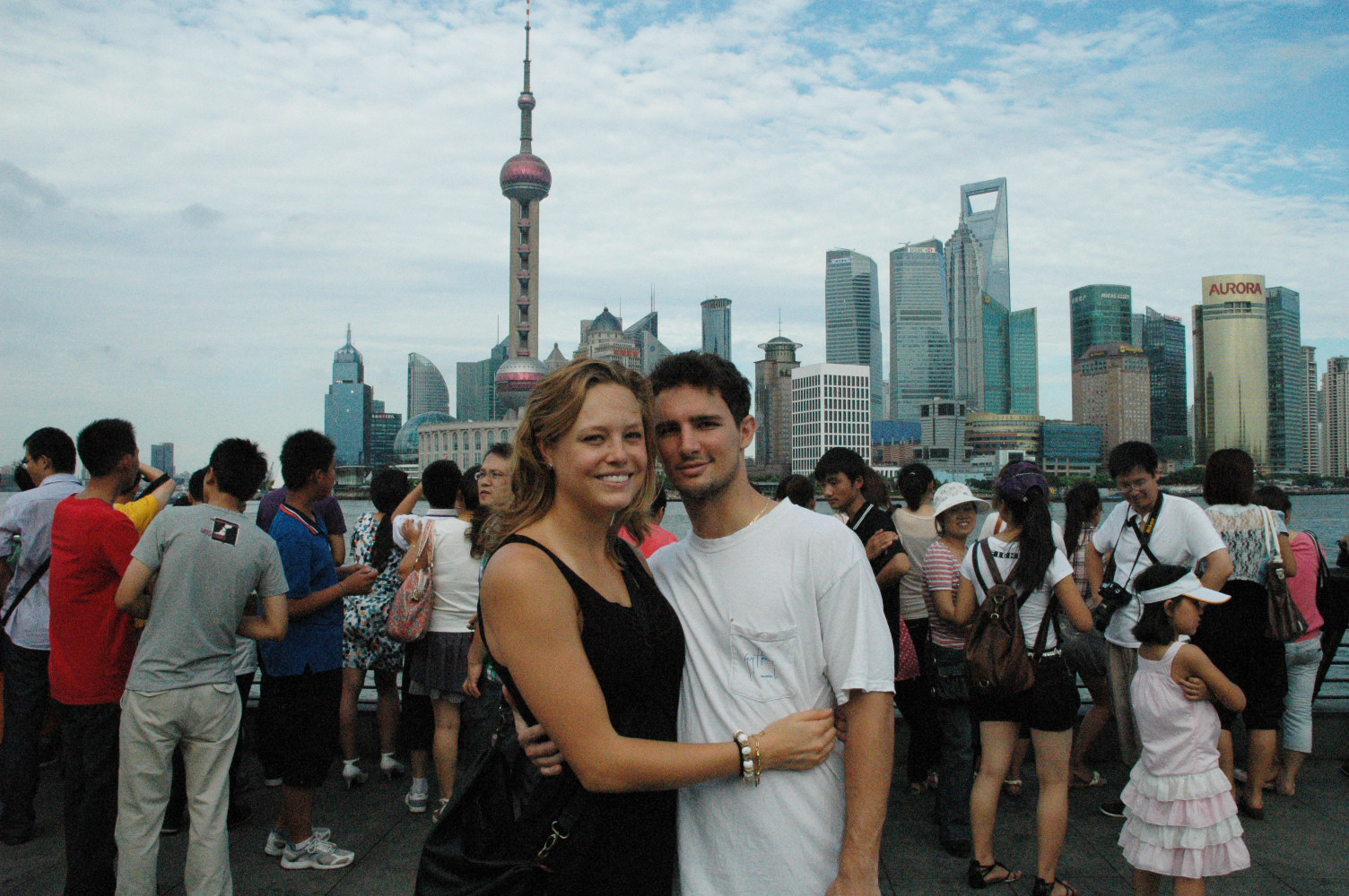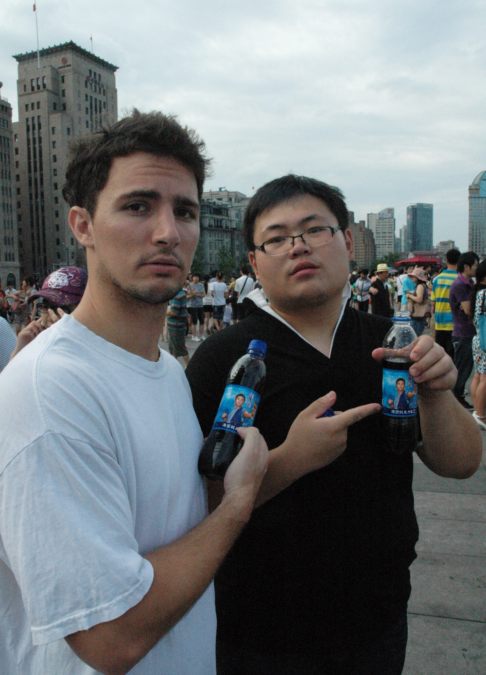 When we are done oohing and aahing (and drooling), we are spit back into the dirty air of the street and are swept away with the crowds toward the Bund. I cannot even begin to describe the Bund. Even if I did, it would not do it justice. It is China’s most popular tourist destination and boasts a spectacular view of the financial district across the Huangpu River. The skyscrapers on the other side are so tall and modern that they look fake…. like they could actually be miniature or made of cardboard and plastic. It is a strange sensation yet spectacular. What also surprises me is the number of people walking along the Bund, taking pictures, and staring at me. I am overwhelmed. Actually I am hot and famished and begin to feel light-headed. We decide to grab some beverages and find a place to grab some much needed food.