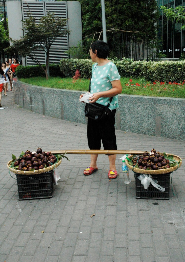 Chinese woman selling ambiguous fruit. You can find hundreds of these fruit peddlers in the cities.