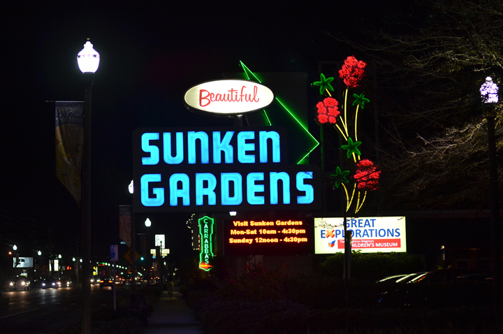 First in a series of vintage St. Petersburg signs. Sunken Gardens is a St. Pete landmark dating back to 1903 when a plumber named George Turner Sr. bought 6 acres of land. He drained an ancient lake, filling it with clay tiles, and began to garden. Neighbors loved walking through his garden so much he started charging a nickel for tours. Three generations of Turners continued his tropical gardens until the city bought it in 1999. Today it remains as a tourist attraction. (source: http://www.stpete.org/sunken/sghistory.asp)