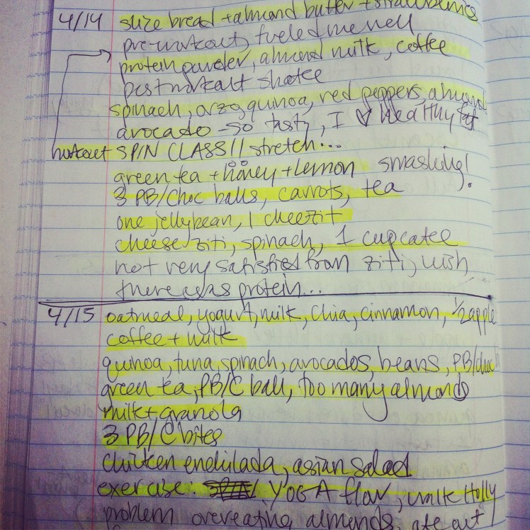 Finally, keeping this food journal has made me aware of the healthy choices I make everyday. It gives me a realistic picture of how much I eat everyday. Sometimes I eat a normal amount but feel like I ate too much since I spread my food out across the day. I am learning to cut myself some slack and trust my body. My body knows what and when to eat. Instead of feeling guilty about eating yet another snack before a workout, I am trusting my hunger and fueling my activity. This is especially enlightening since I workout and eat dinner so late. Of course I need a pre-workout snack at 6:30pm!