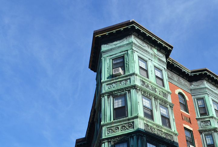 Aged red brick and green copper roofs pierce the sky, asserting their authority.