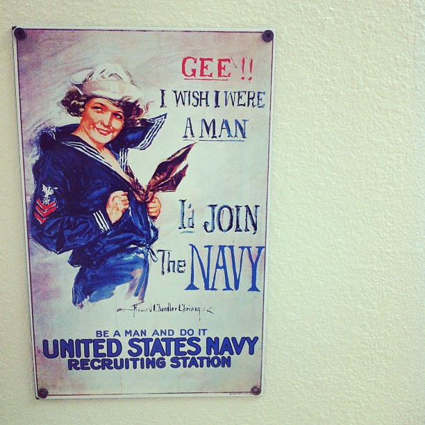 I love this vintage sign. It makes me want to wear a sailor suit and hat with a perfectly curled bob. But I don’t want to join the Navy. Because I’m not a man. So sexist.