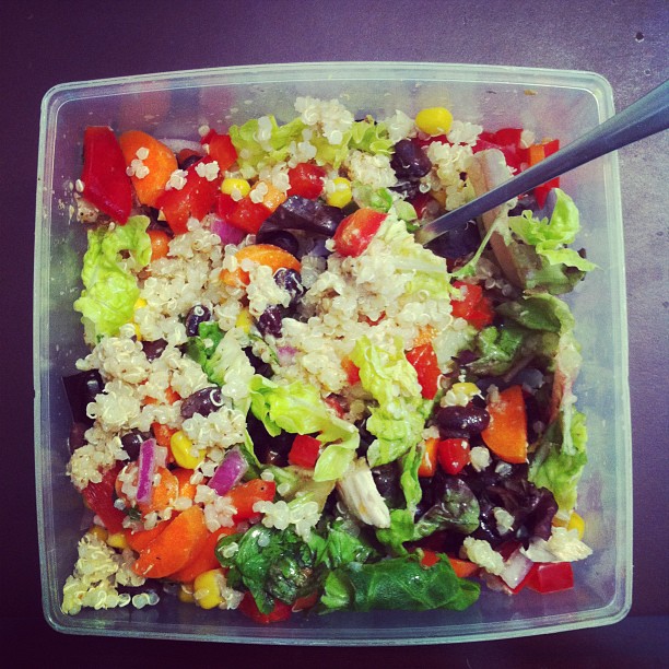 Finished with the bathroom fashion show, I worked for a bit (surprising, I know) and breaked for lunch. Thanks to my late night food prep on Sunday, lunch was an easy quinoa, red bell pepper, carrot, butter lettuce, bean, and chicken salad.