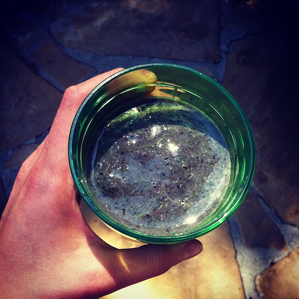 Blend 1 cup almond milk, 1 scoop SunWarrior, 1/2 cup frozen berries, 1/2 frozen banana, 2 handfuls of spinach, and 5 ice cubes. Result? A nice brown colored frozen treat that desperately needs peanut butter.