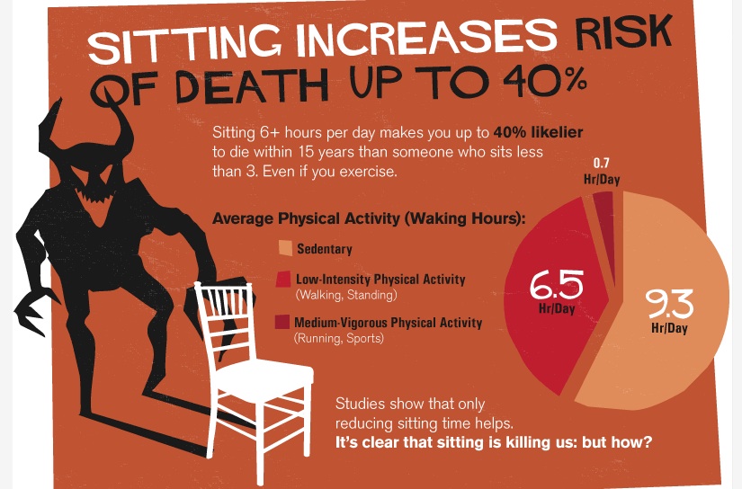 I’m surprised I’m not dead yet. According to this infographic, sitting for 6+ hours a day makes you 40% likelier to die within 15 years even if you exercise. Crap. For all my love of fitness and health, I am certainly doing a poor job of walking the walk. Since I am usually not walking at all.