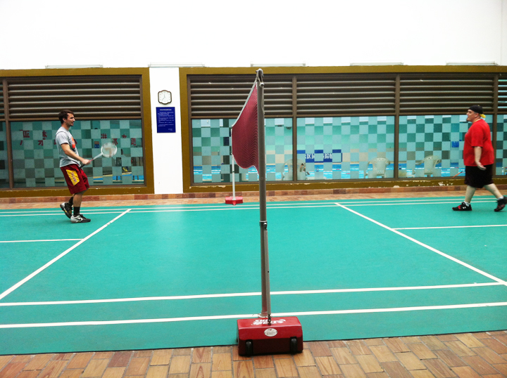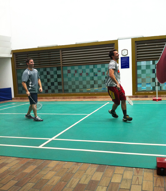 Based on Peter’s crazy jumps you’d think he kinda sucked. Well Mr. Tennis Pro was spiking birdies left and right. I on the other hand struggled with moving my feet and letting my arm swing without too much thought. Too much thinking equaled missing the birdie. Again and again. I blamed jet lag. At least there’s room for improvement.