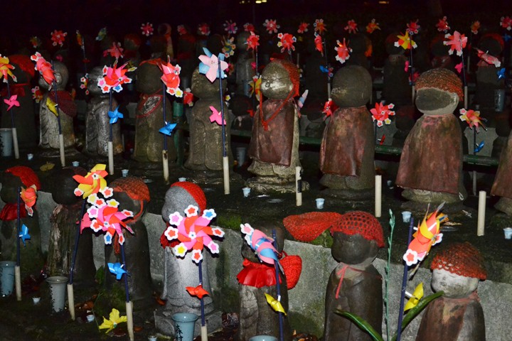 Our next mission was dinner. It was almost 8pm and we were all starving. On the way we passed a temple and more baby Jizo statues all in a row with their red knit caps, bibs, and pinwheels. They are really kind of creepy.
