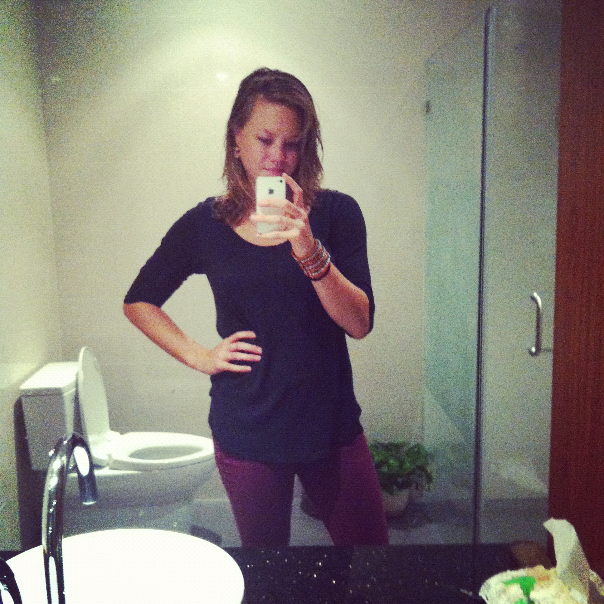 Purple jeans, loose cotton shirt, bright and bold bracelet, and Toms on my feet. This was taken at the spa after my glorious neck massage. It was an absurdly hot day (in late October!) that made me glad to be inside.