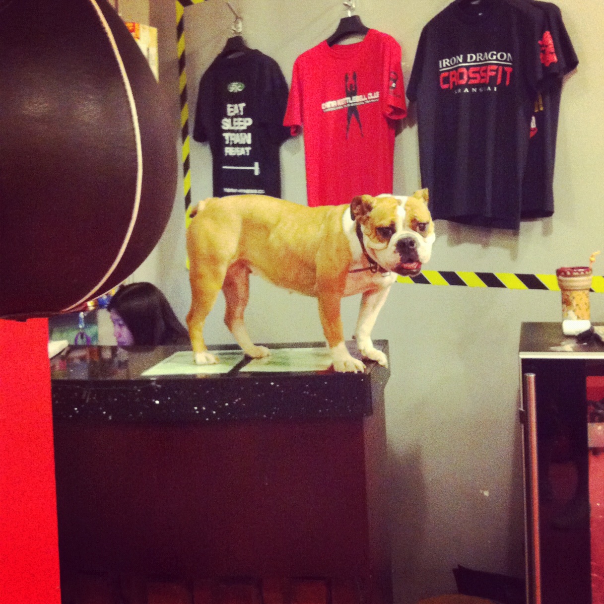 Our trainer Mark has a dog, rabbit, turtle, and cat that are sometimes allowed to roam and play around the gym. It is pretty hilarious. PJ is the guard dog who mans the front desk. And then there is the awesome rabbit that hops around then will randomly bust out crazy flips in the air. Pretty cool.
