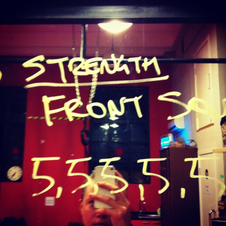 Since I skipped Thursday evening Crossfit due to extreme exhaustion, I was determined to do my own workout during Saturday’s open gym. I needed to break my 3 day exercise hiatus! Fortunately Wednesday’s morning WOD was still written on the mirror and included a strength portion!