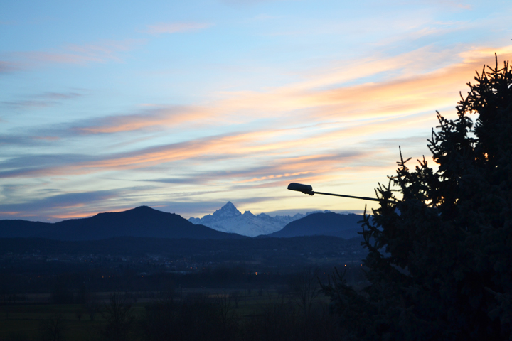 We then headed back to our friend’s house and enjoyed the sunset from his balcony. His home sits against a mountain and overlooks rural farmland. To the right you can see the Alps, including the mountain that looks like it belongs in Paramount Pictures.