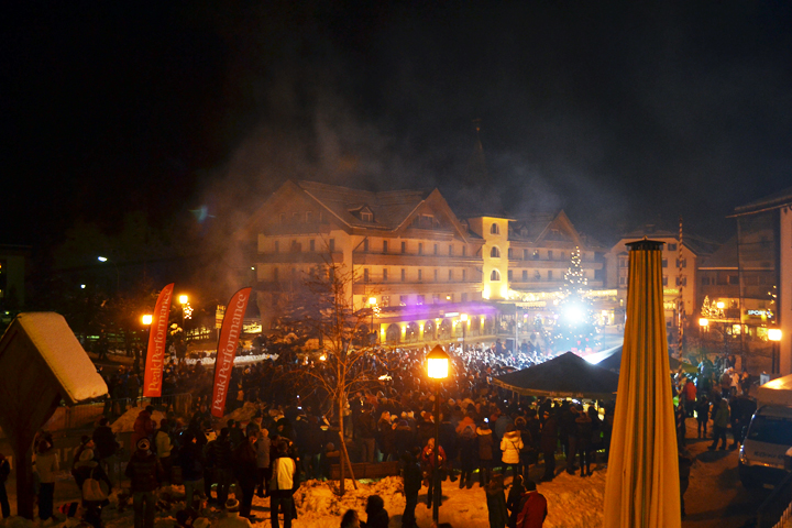 By the time the last course came, it was almost 11:30 pm. I didn’t want to miss the fireworks so I rushed to our room and grabbed my camera and ski jacket. We didn’t have to go far to enjoy the festivities because our hotel balcony overlooks town square!