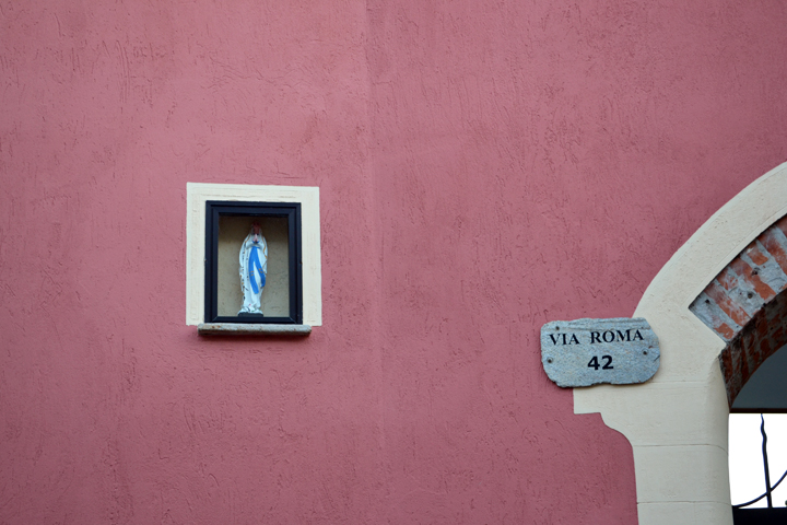 Walking along the narrow street was precarious as cars whipped quickly around corners. We hugged the brightly painted walls as we passed by a few small shops and of course, some religious tokens. This is Italy after all.