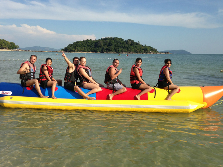 Peter and I seem pretty stoked and everybody else just looks kind of scared. Peter and I grew up boating, skiing, and tubing on the ocean so this is no big deal to us. I don’t think anybody else had ever been in the open water before. They were holding on for dear life which made it rough when the banana boat flipped over. I definitely landed on a few people. Ouch.