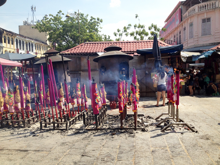 Next, our wonderful tour guides drove us by some well-known places in Georgetown including Fort Cornwallis, the Courthouse, and Little India. We noticed that many Chinese temples were celebrating some event or holiday with dozens of pillars giving off dense smoke. At the end of China Street we got out of the car to take a look at the most prominent Chinese temple in the heart of Georgetown, known as Kuan Yin Teng Temple.