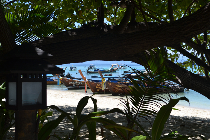We settled in the restaurant and dined on pesto chicken and pad thai while enjoying the natural shade from the trees. Beneath the long branches peeked colorfully decorated long boats anchored on the beach, waiting to carry passengers to the islands beyond.