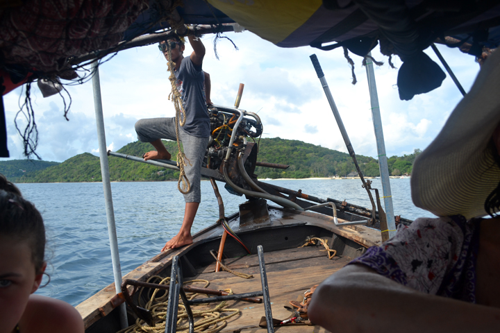 We then boarded the longboat with 3 instructors, a French family, a woman from London/South Africa, and tons of heavy gear. I was facing the back of the longboat and managed to capture the amazing gymnastics of the driver as he steered us away from shore. Using his foot and rope pulley system, he would swing the long motor around and expertly maneuver the boat in different directions. It was crazy to watch.