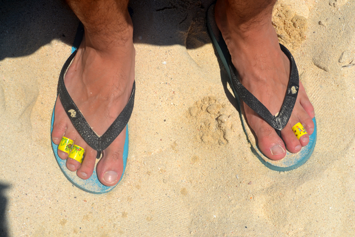 Peter was having a great time with his battered toes in the sand. While scuba diving, the flippers dug into his toes and gave him some nasty blisters. I came armed with a kid-sized first aid kid complete with cute animal cartoon bandaids that Peter sported for a good 2 days. Only on the beach is this style acceptable.
