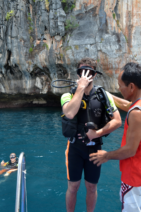 Our first dive site was Viking on the north east side of Phi Phi Leh island. We quickly put on all of our gear and hopped into the water close to a small inlet where a few boats were anchored. This time I did not slip clumsily into the water like last time but only because the captain of the boat gave me a s0lid push forward. Thanks captain.