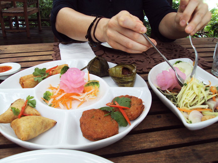 By late afternoon we had finally worked up an appetite and stopped to eat at the Tree Monkey Restaurant, located next to the spice shop inside the Tropical Spice Garden complex. With a spectacular ocean view, we enjoyed smoothies, a spicy mango salad, and an appetizer sampler platter with various Thai and Indian nibbles. Everything was delicious and satisfying! We then bought some spices and gifts at the adorable gift shop. I snagged some stevia leaves, cat’s whisker tea leaves, curry spice, and coconut shampoo. I was stoked!