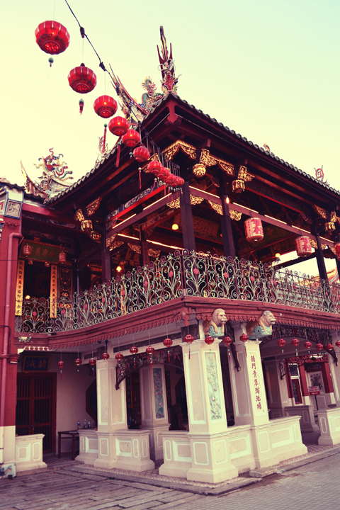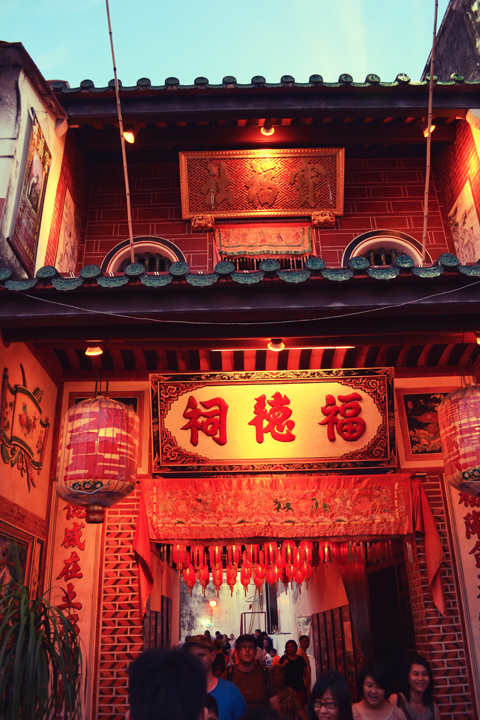 While walking down Armenian street, we encountered many of the Chinese clan temples formed in the 19th century. First we found the ornate entranceway for Cheah Kongsi, one of the oldest Hokkein clan temples in Penang, and were drawn in towards the glowing lights at dusk. A film festival would take place in the expansive courtyard later that evening but we decided to push on.