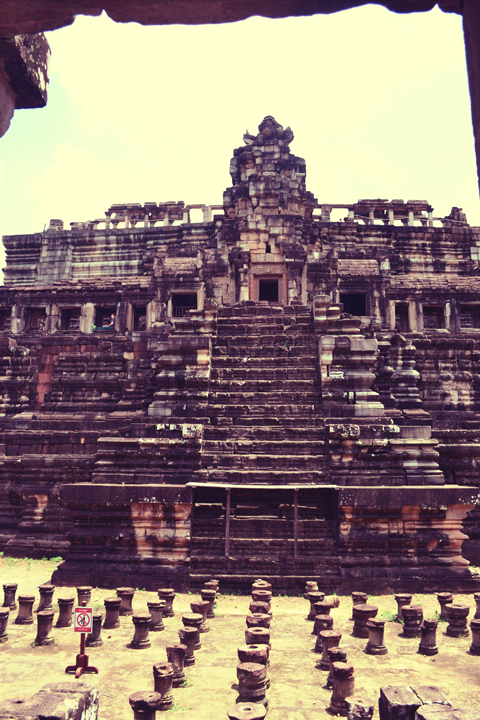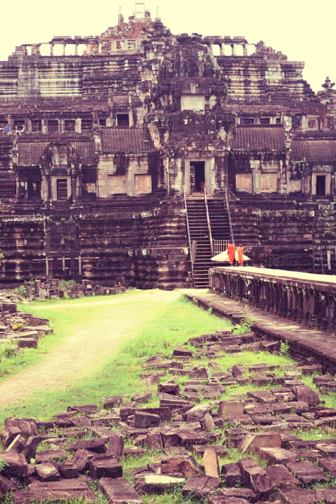 We began walking down a small dirt pathway beneath the trees in the direction of the next temple in the Angkor Thom complex. Soon we came upon a grand walkway raised on rows upon rows of stone columns reflected perfectly in the water below. The walkway stretched from an entrance gate off the main road and all the way to Baphuon, a three tiered temple mountain thrust abruptly into the sky. I was impressed and so were a couple of monk tourists dressed in their brilliant orange robes.