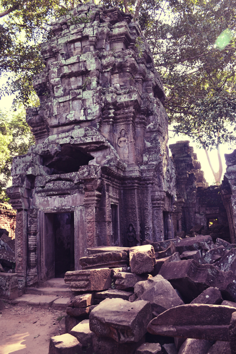 Without any previous knowledge of what Ta Prohm looked like, I was immediately impressed by this incredible temple. No wonder this was selected as a movie backdrop. This place is seriously cool! I thought Banteay Kdei was “one with the forest” but Ta Prohm takes the cake. The forest has basically grown on top of the temple. I am not kidding. Gigantic trees sit on top of the temple like it’s no big deal. Tree roots are so thick that they create their own layers of walls over the original stone. Surprisingly, most of the stone structures are intact despite the tremendous pressure of these enormous trees. It is excessive and absolutely incredible.