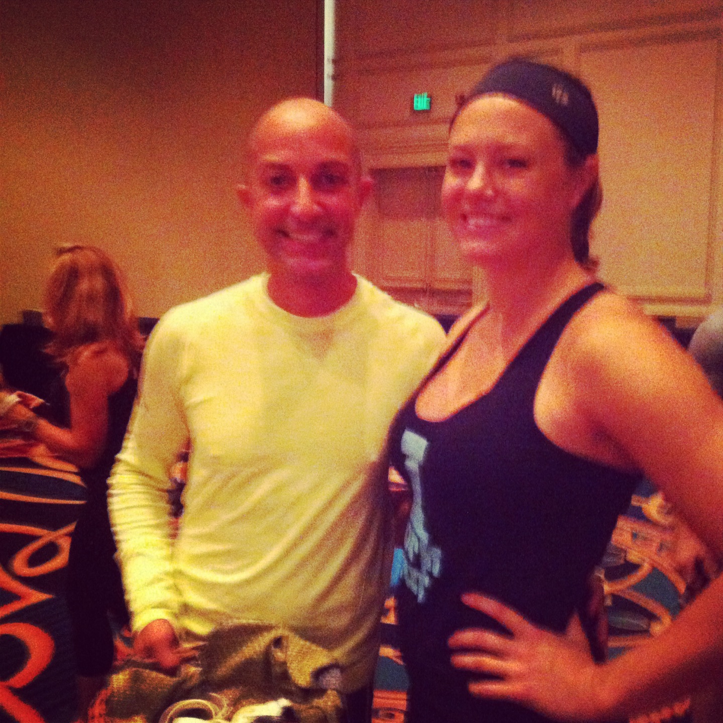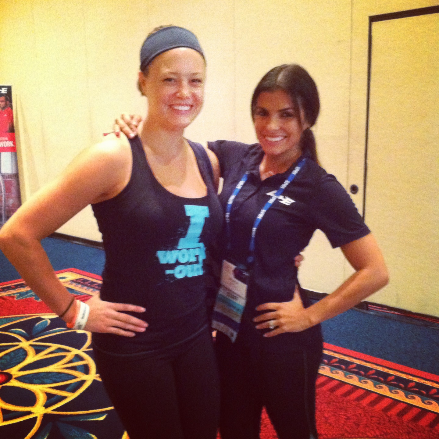 So when I first started studying for my ACE Personal Training Certification, I started watching some ACE training videos led by the beautiful Jessica Matthews. Well on the second day of the conference I happened to notice her across the room and freaked out! Jessica was here??? I made it my goal to meet her. Well she took SHAKTI too and I finally got to meet her after lunch. I said, “Omg you are Jessica from the ACE videos!” And she goes, “Are you the Kirsten from Twitter?” Yeah it was pretty awesome. She was so sweet in person and so short! In this picture I am bending my knees and she is on her toes! So funny.