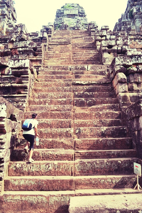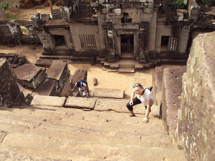 Probably 5 hours or so into our insane bike tour and after Carina took a spill on an evil gravel patch (ouch), we reached our final temple of the day. Ta Keo temple appeared like an enormous mountain, rising from the ground in an explosive block of sandstone. It was awesome. Ta Keo completely lacks any external decorations or carvings after work was abandoned around 1000 A.D. As a result, the temple retains its basic building blocks structure, adding to its enormity. I felt like a tiny little Lego person, clinging for dear life on an enormous Lego mountain.