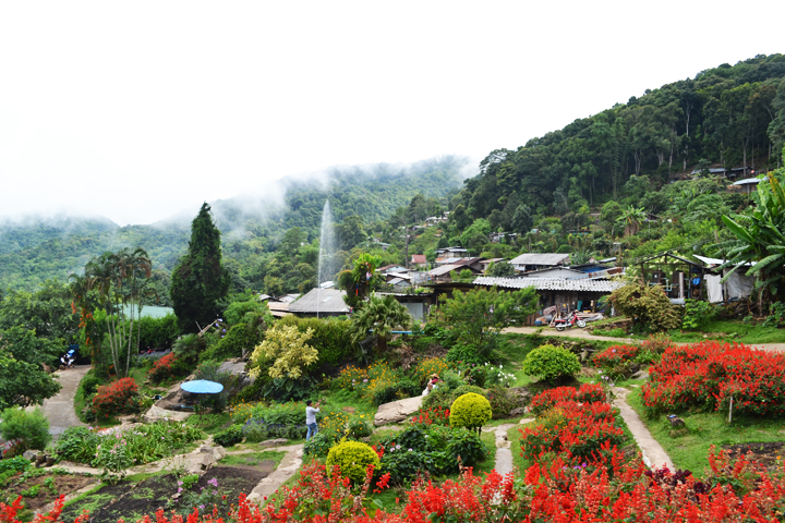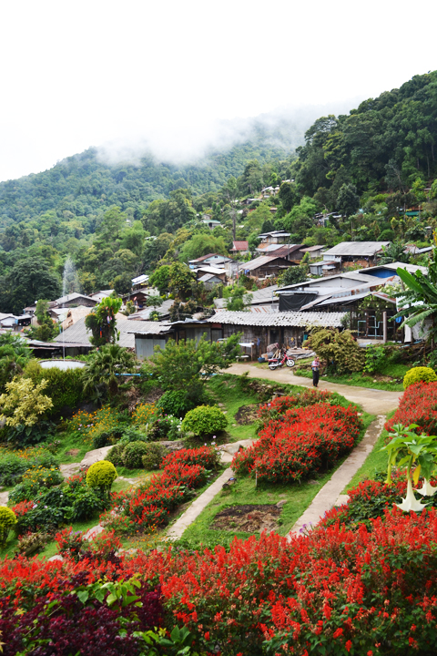 After exploring Doi Suthep, the golden temple in the mountains of Chiang Mai, we continued along a narrow and winding road and arrived at a local hilltribe village. We had no idea what to expect and found ourselves walking up a steep road surrounded by a wall of stalls with locals selling various handicrafts and other items. Somehow we discovered the local “museum” which consisted of a few barren huts with exhibits explaining the history of the various hilltribe peoples. The path then led us to an open garden on the hillside with more huts featuring random “exhibits” showcasing the daily activities of the people. It was a little weird but the garden was beautiful and had an amazing view of the village below.