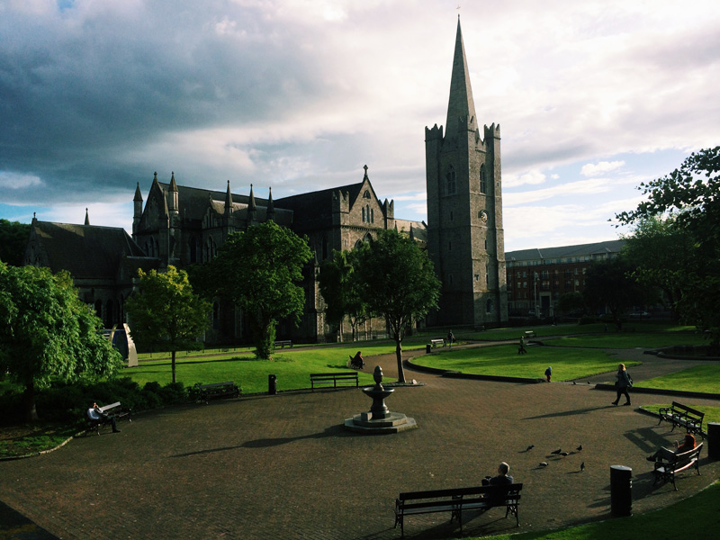 We continued on our walk and literally ran into St. Patrick’s Cathedral, dramatically lit in the slowly dwindling light. Although it was closing in on 8 o’clock, it was still so light out! We sat on a bench and just contemplated the beauty around us (oh and the Free Wifi available everywhere in Dublin).
