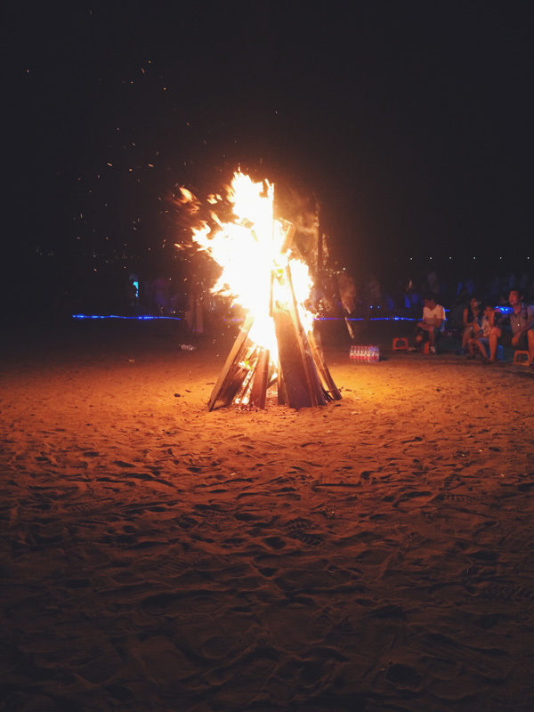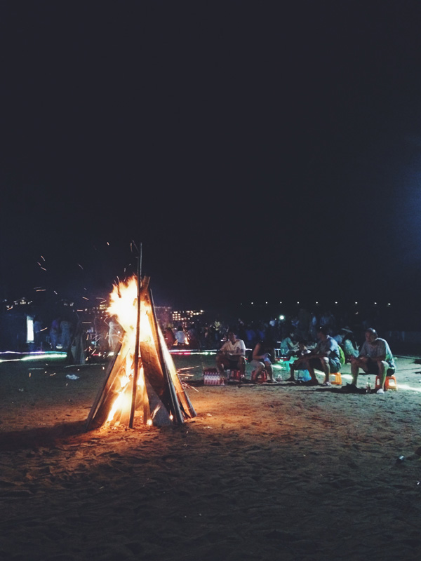 We arrived at what looked like a giant beach party with groups of people crowded around tents and personal grills, enjoying enormous picnics in the dark. Weird. Our group clustered around a pile of wood which a man soon lit up with a propane tank and hose. Standard procedure of course. With the bonfire blazing, we began an epic karaoke session with our very own microphones and lyric screen set up on the beach. Different people stood up to sing Chinese songs and even Peter sang a song which was… terrible. Haha sorry babe.
