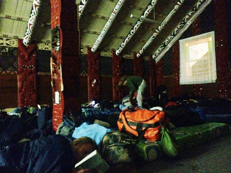 That evening we spent the night in the meeting house on mattress pads and sleeping bags on the floor. Linda had NEVER SLEPT IN A SLEEPING BAG BEFORE which had both of us laughing hysterically at the ridiculousness of our sleeping arrangements. We were cracking ourselves up getting ready for bed under a very “exposed” ancestor carving and with 60 other backpackers in the same room. We stayed up late drinking tea and chatting with our friends before taking a shower in the amazing bathroom facilities and going to sleep in our communal lodgings. It was a ridiculous but fun experience that felt a lot like summer camp. I definitely enjoyed the entire evening and it is definitely something neither of us will ever forget!